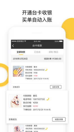 美梨管店,手机里的全能店长 美梨管店,万家美甲店的选择。专注支持美甲店经营,软件服务全部免费。 【特色店员端】 -自动统计员工业绩,激发店员积极性 -店主员工权限有区分,保护店铺数据信息 【经营数据】 -生成数据报表,经营情况一目了然 -生成员工业绩报表,奖罚有依据 【买单记账】 -开通特色店员端,全店记账,高效有序 -会员消费智能扣卡,快速准确 -模拟店铺买单场景,先签字,后扣卡 【多种会员卡】 -储值卡、次卡、集戳卡等,形式多样更懂你 -支持记录附赠项目,满足多种办卡需要 【会员系统】 -会员信息统一管理,一键查询,快速买单 -备注会员信息,建立会员档案 -关注官方公众号,耗卡实时有提醒…