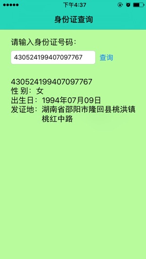 身份证号查询是一款根据身份证号,查询身份证发证地,以及所有人的生日和性别信息的应用软件。 最全的离线数据库,不用上网也能查询身份证等验证信息。 应用特性: - 查看身份证发证地、生日和性别信息。 - 可浏览全国各身份证发证地及对应代码列表。 - 支持历史查询记录功能。 - 支持第18位校验位的计算。 - 支持第18位输入任意非数字键,变成X值。