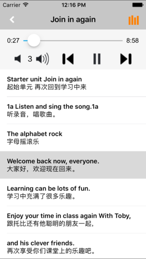 *全套原版录音和教材完全同步,助您成为英语大明星。 *根据课本配套,此应用为外研社(Join in)剑桥小学英语五年级上册、下册完全最新版。 *涵盖全部内容,包括全部课程对话和常用句子、单词列表、复习章节等。 *操作简便、携带方便,永远告别磁带和光盘。 【新梦想】教育应用系列完全同步教材制作,内容完全一致,您可以使用它来进行课文学习,播放教材配套音频,发音纯正地道,寓教于乐,让学习更高效和有趣。 该应用界面简洁操作简单,让孩子在舒适的环境下学习,能点,能读,更能说,是小朋友的好老师、好家长。 功能特色 ■中英文双语对照,同步语音,准确清晰。 ■内容与录音质量放心,地道纯正、原汁源味。 ■语…