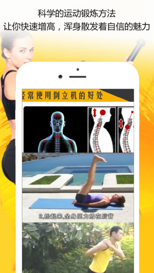 后天增高法-旨在用专业和科学的方法让你挣脱遗传的束缚,实现后天的二次增高 主要功能亮点 -身高预测 根据遗传学预测法预测每个人成人时的身高 -饮食 提供科学的饮食参考食谱 -运动 特殊的运动方法刺激骨骼生长 -睡眠 你要知道长高的关键在于睡觉! 告诉你生长激素几点分泌,入睡前吃什么能帮助增高。