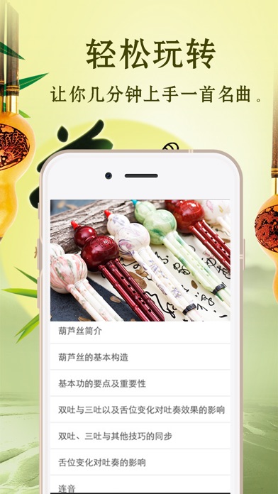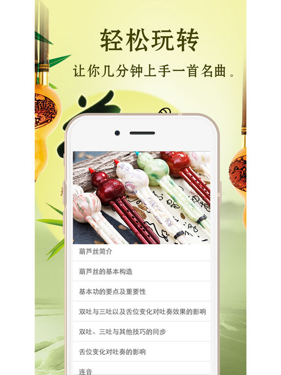 葫芦丝因其音色独特优美,外观古朴,柔美,典雅,简单易学,小巧易携带等特点,受到广大音乐爱好者及中外游客的喜爱。 本App主要内容有: 葫芦丝的历史起源及发展概述 葫芦丝的基本构造 葫芦丝的选购 葫芦丝的保养 葫芦丝的调音 葫芦丝的弹奏技巧 经典葫芦丝名曲集,葫芦丝优美音乐欣赏, 葫芦丝,又称葫芦萧,是云南少数民族的乐器.主要流传于傣、彝等民族中,其音色轻柔细腻,圆润质朴,极富表现力,深受云南人民的喜爱。傣族人民多才多艺,能歌善舞。节日里,不论是在江中划龙舟或是在江边放“高升”(用竹筒制作的土火箭),还是在广场上“赶摆”或是在竹楼里饮酒欢宴,都可以听到动人的乐声。