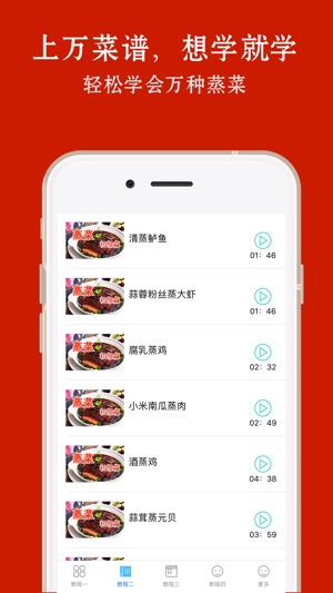 汇聚了国内最全面、最细致、最精美的各类蒸菜菜谱!一应俱全,全部经过全国各地吃货们的亲自验证,就是靠谱! · 最优秀的美食达人,手把手演绎优质图文菜谱,高清视频讲解,让学做蒸菜变的如此简单! · 适合人群的饮食需求,品类齐全,满足你全家的胃口! 不甘心仅仅做一个吃货,想成为能够自己动手的美食家,那么就赶快来试试看吧!这里有多种美食食谱,绝对能在短时间内就提高你的厨艺!