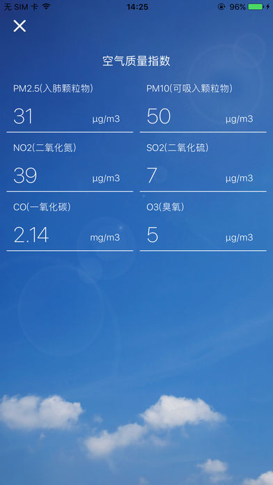 ==最后一天半价!赶快下载吧!== 支持iOS10! PM2.5实时监测仪,关注空气,关心生活质量,关爱健康! *****功能特性***** 1. PM2.5实时监测,雾霾有多重、空气污染情况即刻知晓! 2. 涉及SO2、NO2、PM10、 PM2.5、O3、CO等六项污染物监测,数据来源权威全面而精准! 3. 不同数值和颜色显示,一眼判别空气质量情况,合理安排生活出行! 4. 附带好用的温度计功能,实时监测当前温度!