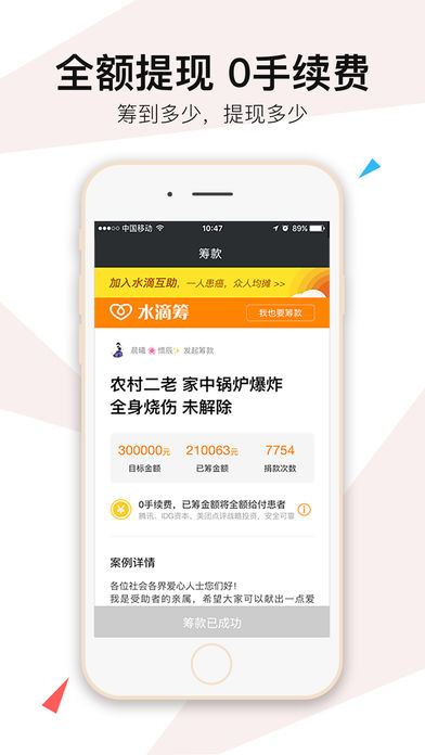 水滴筹是由“水滴互助”推出的众筹平台。提供大病筹款、梦想筹款、农产品预售等多种众筹方式。可以快速发起筹款,分享到朋友圈或社交平台,获得更多人的帮助。 【可以帮您】 (1)大病筹款(患肿瘤、癌症、白血病、脑溢血、尿毒症等疾病,急需治病钱) (2)梦想筹款(搞创作、拍毕业照、毕业旅游、去支教、开画展、拍微电影、打工旅行、做义工等) (3)农产集市(天然、绿色、原厂地直邮、无公害农产品尝鲜) 【获得荣誉】 (1)筹款平台分类TOP5 (2)2016年度中国互联网互助领域诚信经营奖 (3)2016年度 2016创业黑马TOP100评选 中国最具潜力创业公司 (4)腾讯、美团-点评、IDG、高榕资本等5000万元投资 【联系我们】 (1)微信公众号搜索“水滴筹”,直接关注即可 (2)拨打客服热线:400-686-1179 水滴汇聚,终成汪洋 水滴筹---让生活充满可能 www.shuidichou.com