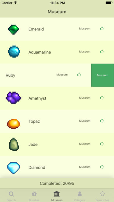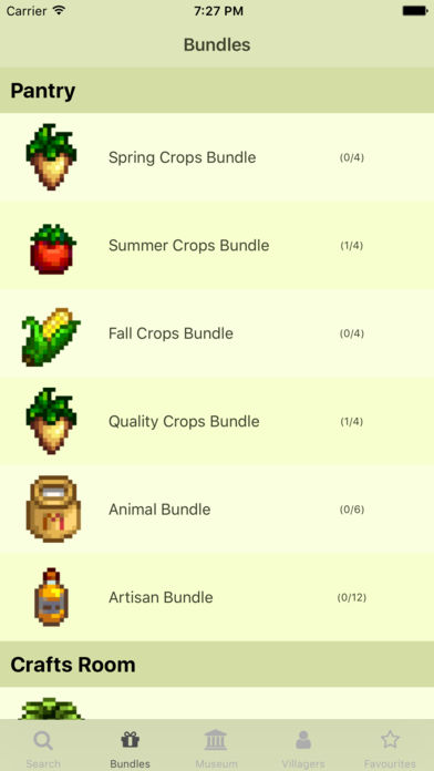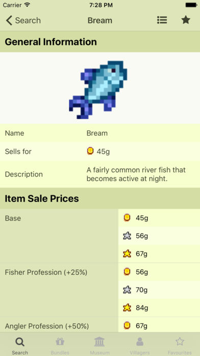 With Stardew Valley Journal, you can see information about all in-game items, their prices, villagers thoughts on them, and other useful information such as their pricing (including artisan items!) and what recipes they can be used in. You can also add items to a list of favourites to enable you to access them quickly. The app also helps you keep track of items you've put in a bundle, caught, grown, shipped, as well as items you've added to the museum.