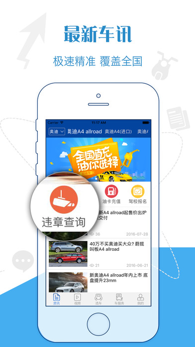 最新最及时的汽车资讯视频,正规权威的违章查询、油卡充值、车辆年检等汽车服务,为您提供便捷的汽车生活,您的爱车贴心小帮手。 *****功能亮点***** 【违章查询】拥有业内优质的违章大数据,覆盖城市400+,官方权威、准确免费,扣分、扣款查询结果一目了然; 【汽车资讯】新车、汽车评测、汽车导购、车展、热点汽车新闻,通熟易懂; 【热点视频】汽车教程、汽车组装、网络热点,大片包您看个够! 【精准选车】新车、二手车,全方位选车条件,助您快速选定爱车! 【违章代办】五年专业服务团队,专人办理,让您省心省力省时省钱; 【油卡充值】油卡在线充值,即时到账,更享加油八八折豪礼,优惠多多; 【车辆年检】更多服务,更多方便,足不出户在线一键搞定。
