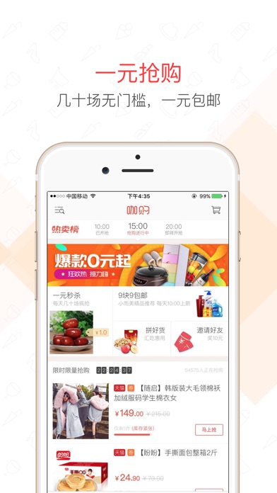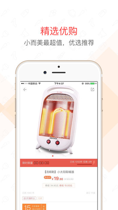 咖购优选专注于品牌独家限时低价折扣特卖秒杀,汇聚淘宝天猫等一线品牌商为买家提供比1元购更实惠的超嗨购物盛宴,是全国首款限时限量品牌低折扣特卖的购物应用。 比卷皮更低折扣,比唯品会更高品质,比蘑菇街更实惠,比折800更低价格,比返利更省钱,每天几十场次的一元疯抢嗨爆全场,咖购是你必备的手机购物省钱神器。 产品优势 【抢购】限时限量,每天十余场品牌抢购。 【拼购】组团拼单,让你和好友尽享超值底价; 【玩购】快乐购物,超嗨的网购盛宴你就是主角; 【咖购】逛逛买买,尽情挥洒你对人生的任性;
