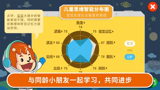 ● 2至7岁儿童必备思维开发游戏,由权威育儿专家领衔研发 ● 内容基于幼儿园教学大纲,融合国际元素,分大中小班 ● 3000多关趣味思维课程游戏,全方位挖掘孩子潜能 ● N种趣味场景,让孩子玩不厌学不厌 ● 系统记录孩子学习数据,让家长有效引导 波比全脑是一款面向学龄前儿童思维开发、提升注意力、德育引导、激发想象力的全脑开发课程游戏。超过3000关趣味游戏,分为小班版(3岁),中班版(4~5岁)和大班版(6~7岁)。 波比全脑思维课程游戏,针对2-7岁不同年龄段孩子的成长特点,系统开发培养孩子在数理、语言、常识、逻辑、比较、听觉记忆,空间、 图形、辨别、规则、创意、视觉记忆等12个领域的潜能,训练提升孩子的专注力、观察力、记忆力、想象力、团队协作等重要的基础能力。 软件通过直观的图形显示孩子的学习数据,记录孩子在这12个领域的发展情况,让家长有效地引导孩子进行左右脑训练。让小朋友们快乐地学习,短短的一个月,孩子的思维能力将高于大多数同龄人,注意力将会更集中,学习更认真。 2-3岁是儿童认知、情感、思维和语言发展的基础阶段。波比全脑小班课程,旨在帮助孩子以对生活的认知为基础,建立基本的社会规则,发展其自我控制与规则的概念,培养其思维的发散性与逻辑性,为孩子智力与情感的发展建立基础。 3-7岁是儿童建立学习兴趣和思维能力的重要阶段。波比全脑中大班课程,旨在开发孩子数学性思维能力和理论性思考能力,建立从平面到空间的认知,培养孩子的创造性和策略性,建立对社会性规则的认知以及数学性语言的表达,为孩子的逻辑思维能力的发展提供必要的训练。 波比全脑官方微信:witmami 波比全脑亲子邮箱:tech@1bobi.com 波比全脑官网:www.1bobi.com