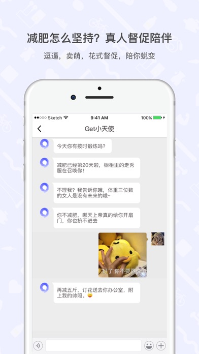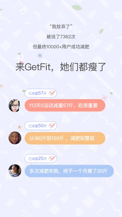 在GetFit,10000+人成功减重,累计减重31000+KG(约等于31吨)... 它们变瘦的法宝是:聊 着 聊 着 就 瘦 了 !(划——重点) 平均聊100句就能瘦1斤的保证新奇又绝对健康的减肥方法。 我们就是要让减肥变得更简单~(ノ・ω・)ノ゙ GetFit都聊什么? 【鼓励陪伴·减肥动力满格】 挑选你的专属陪练小天使,提供温暖陪伴和鼓励,减肥不再独自奋斗、困难不再独自克服。根据个人任务完成情况适时发送提醒通知,更有偶尔撒娇卖萌表情包专场,从此减肥不再只坚持三天。 【方案定制·专业科学瘦身】 由美国ACE私教根据你的身体数据、作息时间、个人目标,量身打造科学有效且人性化的运动计划,在家就能轻松减肥。想要躺着瘦?仰卧起坐Hin适合呀!女生来例假?我们有生理期瘦身模式! 【健康饮食·实时全面餐评】 国家注册营养师为你打造渐进式饮食计划。减肥最重要是吃得好,光靠吃就能113天0运动减重57斤!由专业营养师设计的GetFit餐卡系统,教你打造健康饮食计划,让你吃饱吃好,越吃越瘦~ 【安心保障·胖了就给钱】 推出百万妹纸关注的吃胖险,胖了按斤赔。服务有保障,购买更安心,在GetFit,你一定会瘦! 【他们都瘦了有话说】 青晨:113天0运动减重57斤,我用亲身经历告诉你吃的重要性!感谢喵喵哒,感谢GetFit,给我一个全新的自己。 姜没空:一个月拥有马甲线,坚持是获得美好肉体的秘诀。我不是很有意志力的人,但是却在小天使的陪伴下坚持了一个月,并且,会一直坚持下去! 咕咕咕:从180斤到130斤,我只能告诉你“减肥如整容”。没有人知道我尝试了过少次减肥,也不会有人知道肥胖带给我多少痛苦。不过都不重要了。因为现在,我已经瘦了...GetFit真的让我get fit了,已经爱上这样充实又健康的生活方式~
