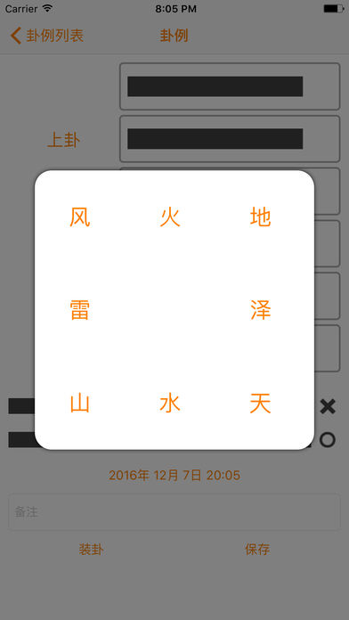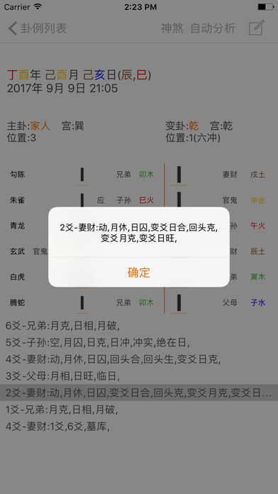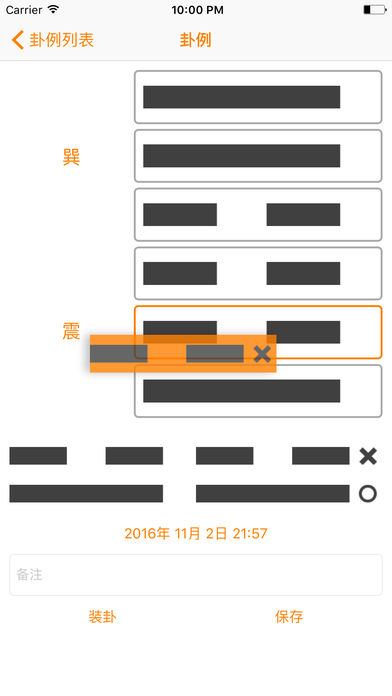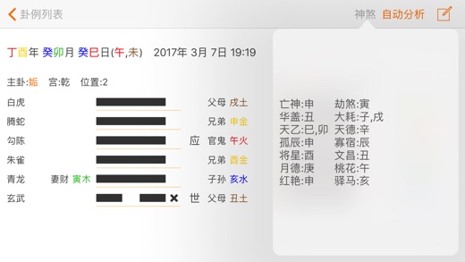 作为一位六爻爱好者,发现无论网上或者App中,没有一款六爻排盘软件可以方便用户进行拖动爻位的快速实现方式,特此开发此软件帮助用户快速起卦,并且对纳甲地支进行颜色区分。 本App提供起卦和辅助分析功能,所以建议有一点六爻基础的人士使用,如有疑问请发邮件至lswlester@hotmail.com或加微信15900339338进行咨询 ----使用说明: 1.选择爻象创建卦例,请长按阴阳4个爻位的爻象,会出现拖动画面,拖动爻象到所属爻位上 2.直接点击“上卦”,“下卦”,快速选择卦象 六爻排盘专业版1.7 ----功能特点 1.设置卦象起卦还是卦名起卦 2.卦词显示与译文显示 3.爻词显示与译文显示 4.自动分析每一爻位在日月组合下的旺衰情况 5.自动分析动爻与变爻之间的关系 6.自动分析三合局所处爻位和合局关系 7.自动分析爻位墓库,日墓,动墓 8.自定义显示 象辞/彖辞 9.断卦 结果/反馈 记录 10.备份用户卦例记录功能,并上传至网站 11.纳干纳支自定义显示 12.夜子时干支切换功能 13.数字起卦功能(河图数) 14.卦身爻位显示 15.宜变之爻显示 16.横纵屏幕显示 六爻排盘精简版 ----功能特点: 1.爻位拖动动功能 2.根据纳甲法原理自动纳入地支到爻位上 3.自动显示空亡
