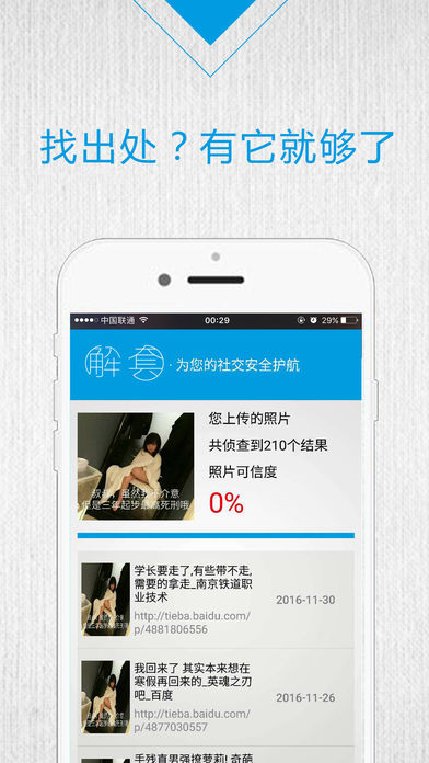 图片找出处,电影找来源,照片可信度——解套App,是一款可以帮助用户识别对方头像是否真实、鉴定可信度的图片识别工具,让日益兴盛的移动网络社交增添一分真诚的保障。