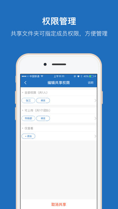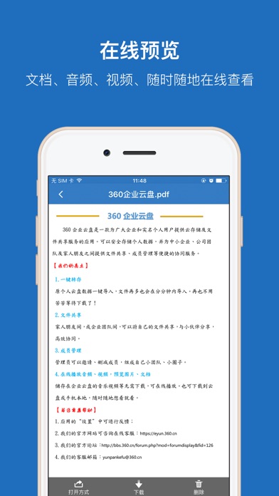 360企业云盘是一款为广大企业和实名个人用户提供云存储及文件共享服务的应用。可以安全存储个人数据,并为中小企业、公司团队及家人朋友之间提供文件共享、成员管理等便捷的协同服务。 【我们的亮点】 1.一键转存 原个人云盘数据一键导入,文件再多也会在分分钟内导入。再也不用苦苦等待下载了! 2.自动备份 手机中的照片、视频可以备份到云盘,随时随地想看就看。 3.文件共享 家人朋友间,或企业团队间,可以将自己的文件共享,与小伙伴分享,高效协同。 4.权限管理 共享文件夹可以指定成员权限,方便文件管理。 5.成员管理 管理员可以邀请、删减成员,组成自己小团队、小圈子。 6.在线播放音频、视频,预览图片、文档 储存在企业云盘的音乐视频等无需下载,可在线播放。也可下载到云盘或手机本地,随时随地想看就看。 说明: 自动备份、后台下载文件时会消耗更多电量、影响电池续航时间。 【若您需要帮助】 1.应用的“设置”中可进行反馈; 2.我们的官方网站可咨询在线客服:https://eyun.360.cn 3.我们的官方论坛:http://bbs.360.cn/forum.php?mod=forumdisplay&fid=126 4.我们的客服邮箱:yunpankefu@360.cn