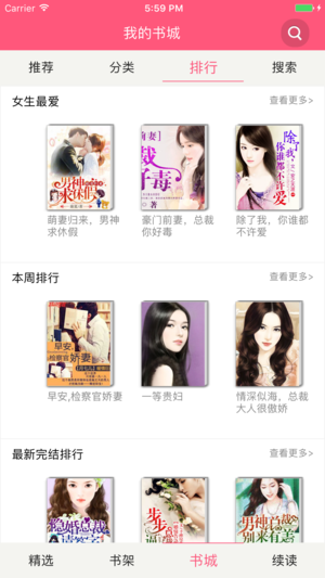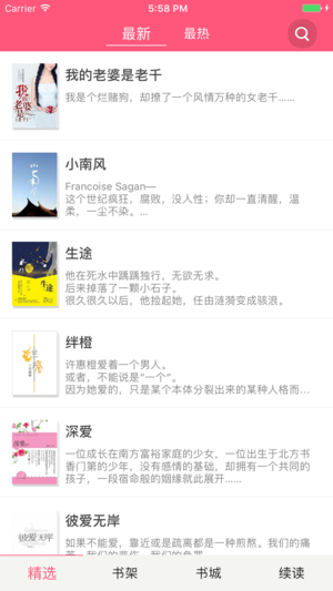 言情爱好者的必备神器。 最专业的阅读软件,高品质图书任你挑,热门书籍一网打尽。 书城随时更新,一键下载,离线阅读,再也不用为流量担心了。 极致排版,完美展现,给你带来舒适的阅读体验。 小编精心推荐,重生、高干、医生、父子、军旅等经典之作只需轻轻一搜。 鬼故事、悬疑、武侠、科幻、军事、职场励志、女性等作品带给您另类体验。 一缕阳光,一杯清茶,享受宁静的阅读时光。