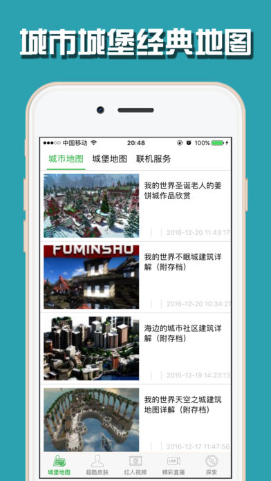 我的世界地图系列城市城堡世界地图。 包含近100多款超大型,小型,中型地图,并有制作地图教程。 其中有我的世界空中堡垒、姜饼城、不眠建筑、海边城市社区、天空之城、欧式城堡、悬浮UFO城市、海底城市、现代城市、未来城市等等建筑的地图,应有尽有。 功能介绍: 1,城市城堡地图、联机服务列表。 2,超酷皮肤:很多很赞的皮肤哦。 3,红人视频:籽岷、小智、悠然小天、小本等红人视频攻略解说。 4,精彩直播:现场直播。 用户反馈: 飞天小猪:这些地图太大了,做出这种城市城堡地图的人太厉害了,城市地图里什么都有,有天上城堡,地下城堡什么都有,太赞了。 李梅:非常棒,学到了好多东西,城市的建筑,城堡的建筑,还有迷宫,非常好的地图!