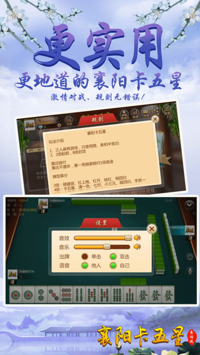 ~~~游戏介绍~~~ 【最地道】地道襄阳麻将玩法,可碰、杠,不能吃牌,仅使用“条”“筒”花色及“中发白”共计84张牌进行3人游戏,杠钱单独结算。富有别致趣味性。要玩就玩襄阳人自己的麻将。 【最好玩】再也不用苦于配桌,全民手机时代,你可以再手机上随时随地和亲朋好友搓麻将,是传统麻将馆的有力补充。快来和亲朋好友一起开房,决一高下吧! 【最稳定】大厂出品,确保游戏过程更加稳定,专心玩游戏,没有掉线卡顿烦恼。 【最靠谱】可以录像回放,同IP报警,杜绝外挂,真实可靠。 【最智能】智能提示、界面大方更具人性化,支持智能单独、分开支付房费。