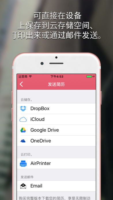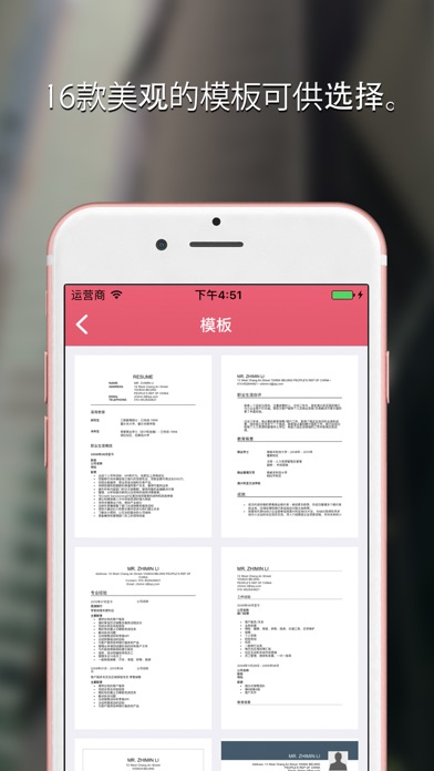App Store中最先进的简历制作器。 像专业人士一样制作简历。简历制作器应用让您能够打造出吸引眼球的简历。您的简历会给潜在雇主留下第一印象,因此您一定要让简历体现出您最佳的一面。 简历制作器的主要功能是为您的信息安排布局,让它们出现在应该出现的地方,并让制作简历变得简单快捷。 主要特色: • 16 种专业简历模板供你选择。 • 简历制作小贴士,教您制作出一份完美简历。 • 面试技巧,帮助您为面试做准备。 • 支持 Google Drive、iCloud、OneDrive 和 Dropbox 云端存 储。 • 支持直接从智能手机或平板电脑等移动端打印或发送简历。 • 用户界面简洁、友好。 • 可添加求职信。 • 支持在求职信后附上个人签名。 • 无数量限制,针对不同公司定制不同简历。 • 支持随时查看。 • 支持添加原创模块。 • 支持边缘及模板调整。 • 提供拼写检查,避免出现错别字。 • 支持导入个人相片,或即时拍照功能。