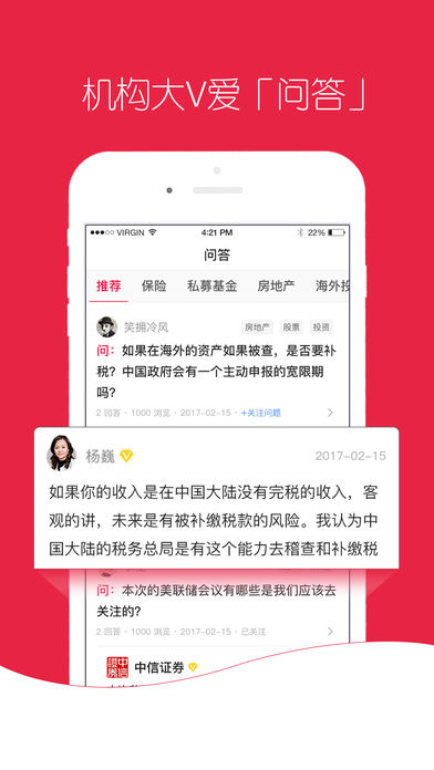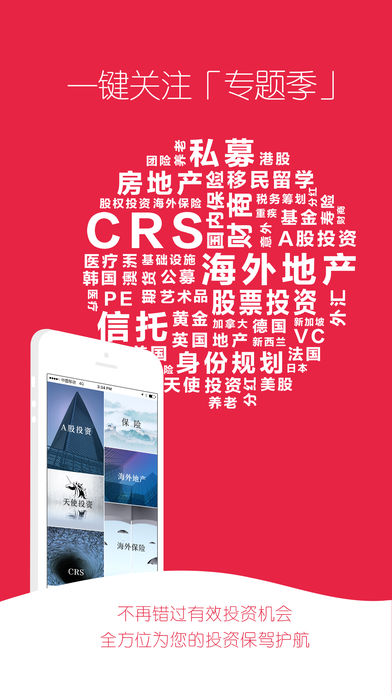 在全球资产配置的大背景下,依托中信系各头牌投资机构,整合海内外一线金融服务资源,将丰富多彩的线上直播,线下活动,专家咨询问答,一并推送给你。 金V说,您的投资决策第一站! 【直播.活动】 联合中信证券——中信证券首席策略师详解当下投资玄机 联合亨瑞集团——权威解析EB-5延期与最新美国移民政策走向 联合链家海外——布局英国房产!聚焦曼切斯特置业分析会 联合华税律所——CRS 挑战、风险与税务筹划 联合天使实战学院——天使投资,你不可错过的下一个造福浪潮 更多精彩直播按周上新中,目前已成功直播超过80场活动,参与直播人次超过50W。 【专题季】 《A股投资》:隶属于股票投资方向,联合中信证券推出针对A股的精品专辑,旨在为投资者提供“资讯、策略、组合、沙龙”等全方位投资顾问服务,未来择机上线美股、港股等板块; 《保险》:借力风险管理与保险规划、实现财务自由的安宁生活。话题涉及养老,医疗,重疾,分红,团险,意外,寿险等,尽早认识保险,提高风险意识,合理规划保险。 《海外地产》:一线实操达人为您详解美国,加拿大,澳洲,英国,德国,法国,日本,新西兰,韩国,新加坡,香港等海外地产投资相关决策需要的一切信息。 《天使投资》:有人说:VC是一夜情,而真正意义的天使投资是爱情,天使投资风险更高,更考眼力和判断,更需要准确的洞察趋势,赌对一个产品或团队。你都准备好了吗? 《海外保险》:高净值用户为什么将海外保险作为资产配置的重要部分?香港、美国及新加坡等国家的养老,医疗,重疾,分红,寿险的详尽介绍及投资攻略。 《CRS》2017年1月1号,全球数十个国家地区将同步实施CRS,之后,全球超过100个以上国家地区都将实施金融账户信息交换,高净值用户如何应对?本专题全面聚合CRS详尽信息,集中剖析,无缝护航海外资产。 《身份规划》:美国,加拿大,澳洲,欧洲,日本,香港等国家移民及留学过程中息息相关的中外法制体系、社会制度、文化差异的全方位解读。 更多专题季持续上新中,一键关注专题,不再错过有效投资机会。 【问答咨询】 平台智能匹配一线实操专家机构,为您解决投资过程中遇到的一切问题 问:如果在海外的资产被查,是否要补税?中国政府会有一个主动申报的宽限期吗? 答:未在中国完税的收入未来是有补缴税款的风险的,中国税务总局有能力去稽查和追收税款,至于中国政府是否有一个主动申报的宽限期,参考美国FATCA(如果在规定时间,主动去信息申报,可以既往不咎,最终还是以条款为准。) 问:股权投资怎么才能赚钱,模式有哪些? 答:赚企业价值增长的钱,企业未来有成长空间,就有机会获得成长收益;赚不同人心理预期差异的钱,不过一级市场投机比较难做,操作人需要掂量一下是否有这种把控时机的能力;赚估值体系差异的钱,资本市场不同群体、地域、公司估值也有比较大差异;最后是通过概率赚钱,比如二级市场量化模型,每一次赚的钱不多,但是能保持持续性,最终回报也比较理想。 问:海外地产单体净租风险小,投资收益也比较低,对吗? 答:不完全对,一些经营比较好的行业巨头,标普评级比较高的项目,这样的物业风险低,收益低,但是一些全美连锁的休闲餐饮,牛排西餐厅、肯德基、星巴克等,物业比较大,企业担保,收益就很高,大约在5-6%。 问:香港保险有什么优势,为什么很多中产都爱去香港买保险 答:概括来说就是保费低,回报率高,保障全面,法规完善,理赔规范,严进宽出,美元保单,离岸资产,全球保障。 【学投资】 《海外十国购房秘笈》——链家集团海外事业部总经理为您系统讲解10个海外热门国家购房攻略和风险防范。 《美国商业地产投资前哨》——美国五大商业咨询机构研究员,带你畅游美国商业地产投资机会!每周两次,畅听一年! 《特色小镇投融资模式与实务》——国内首个特色小镇精品线上讲座,深入浅出,助您全面掌握实操攻略。 《天使投资实战攻略》——天使实战学院创始人桂叔带您一起分享天使投资实战经典案例。 《华尔街时间读报》——每天三分钟带您快速了解每日全球投资风向,不放过任何一个投资机会! 《小小投资家的第一课》——让全球30位顶级金融投资家的财商故事伴随你的孩子长大! 《“巍”说投资精华版》——美女总裁告诉你50个投资中必须了解的基本常识和风险。 《直播精华笔记集锦》——10场精华专家直播笔记,囊括2016年最重要的投资方向。 更多精华专辑陆续上新中。 联系和反馈 对于产品如有任何疑问及建议,或有合作意向,请联系我们 网站:http://www.jvtalking.com 客服电话:400-886-1419 合作邮箱:yunying@citic-finance.com 客服微信:jin-xiaov(昵称:金小V)