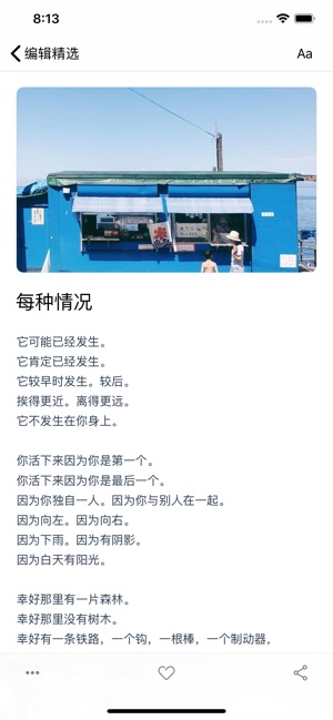 * 千首精校现代诗歌推荐,每天一首 * 配图来自 Instagram 世界级摄影师作品 * 万首数据库现代诗歌,收录 14+ 个国家的现代诗人作品 * 界面设计精致清新,干净、无社交、无干扰 现在是入手『青稞』的最佳时机! 人生来有一种分享的本能,因为分享才有了青稞。五年来,我们一直在分享和传递一种诗意的态度。 我们所理解并传递的诗意,不是环游世界,不是咖啡店,不是乐队成员,也不是年轻时的盛世容颜。我们传递的是一种优雅从容的态度,一种淡而不近的温暖。 事实上,没人能够真正教会我们生活,也许现代诗歌可以带一带路。 这世界就像一个巨大而复杂的机器,小小的齿轮就是我们。所有人各自运转着自己…