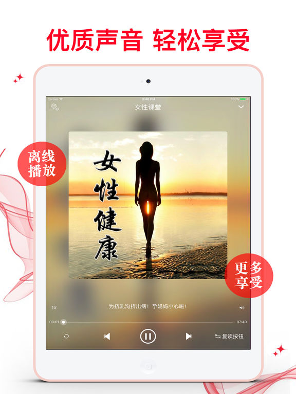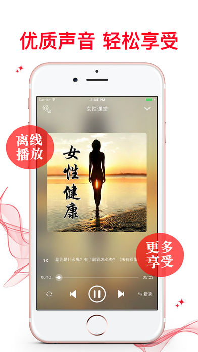 健康是美最关键的因素。现代女性都十分渴望有一款能指导自己如何更健康,以便使自己更加美丽,更加成功地追求事业。 《女性健康》分为:生理、保健、心理、美容、疾病五大部分,介绍了女性的生理心理、女性日常保健、美容化妆、减肥等内容,以及女性常见的疾病和治疗方法。内容全面,通俗易懂,条理清晰。 看书看久了,不妨试试用耳朵听的方法来改变自己的魅力,提高自身健康,做更十分新时代女人。 软件特色: 1.丰富的离线数据包,一次下载,随时享受 2.通用应用,同时支持各种设备 3.可以自动顺序播放功能 4.可以自动记录播放位置,不用担心下次找不到听到哪 5.支持离线播放,即使不联网也一洋听,到哪都不怕 6.支持手动拖拽前进、后退播放 7.精确到分钟的睡眠定时功能,让您睡眠更轻松 8.支持多任务功能,让您一边享受精彩有声读物一边还能打开其他的软件……做一切你想同时做的事 9.在兼顾软件容量以及更多课程的情况下,我们最大限度保证音频的高质量,每个有声读物片段都是经过我们精选和亲测