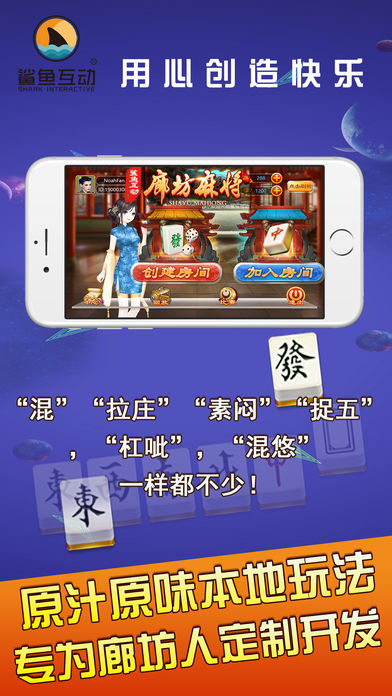 《鲨鱼互动》廊坊麻将为”千雷科技“精心打造的手机端麻将竞技品牌。游戏以“原滋原味,当地玩法”为特色,结合“社交+竞技”的新理念,让朋友间可以利用手机轻松约局,不受时间,距离,场地和设备的约束,自由的切磋牌技,交流互动,享受朋友之间的乐趣。《鲨鱼互动》注重“圈子,社群,分享”,将在各地成立以麻将民俗文化为主题的社群“雀友会” 并将组织“雀神争霸赛”等一些列精彩的有奖赛事活动,为您带来全新模式的麻将娱乐体验!