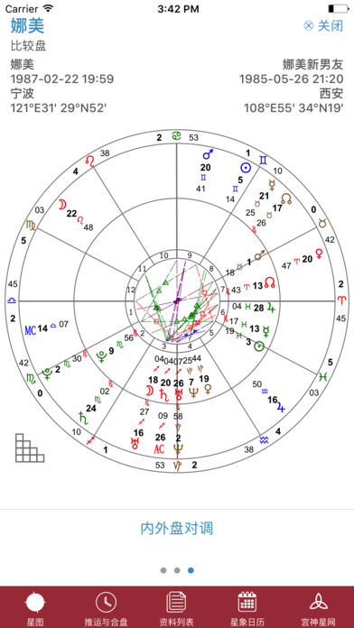 宫神星 – 职业占星师御用神器,宫神星网官方App 宫神星网作为最专业的古典占星网站,一直深受职业占星师与占星爱好者的喜爱。应广大用户的强烈要求,特此推出官方App,将网页的体验搬到移动平台上,并针对国内用户的网络情境量身打造。使用界面简洁专业,多种排盘功能齐全,并且支持网站端与手机端同步共享数据。 无论您是专业的占星老师或是占星的初学者,宫神星App都是您口袋里不可或缺的方便工具。 - 特色 * 离线排盘 * 宫神星网星盘资料同步 * 采用苹果内建地图 * 国内与世界城市经纬度查询 * 同时开启多个星盘,左右平滑切换 - 排盘功能 * 本命盘 * 流年星 (Transit) * 太阳弧 (Solar Arc) * 次限盘 * 次限盘对本命 * 三限盘 * 三限盘对本命 * 太阳返照 * 月亮返照 * 比较盘 (Synastry) * 组合盘 (Composition) - 显示 * 单轮图 * 双轮图 * 相位表 * 比较盘支持内外盘交换 * 推运时间步进调整 * 本命盘表格:古典特征、黄道状态、宫位、法达星限、小限、阿拉伯点、恒星 - 计算 * 支持常用的普拉西德、阿卡比特、等宫制等12种宫位制 * 容许度计算可选择古典星光或是现代相位 * 容许度可调整 * 法达星限支持波那提与Abu Ma'shar制 * 星体计算基于瑞士星历表 - 星盘资料 * 可登入宫神星网帐号后,与网站端星盘资料同步 * 可建立自定义分类文件夹、方便管理记录每张星盘 * 地理资料可由地图查询、或是直接输入国外地名查询