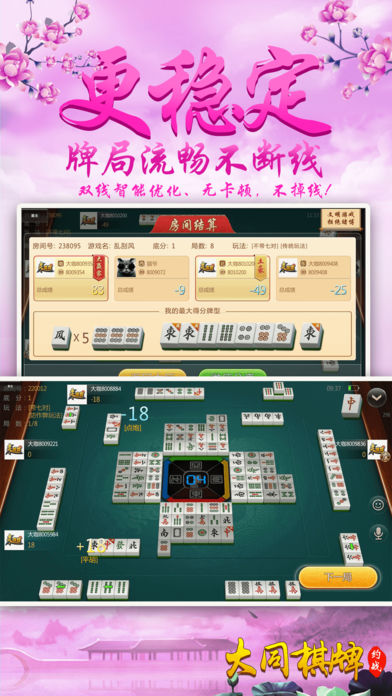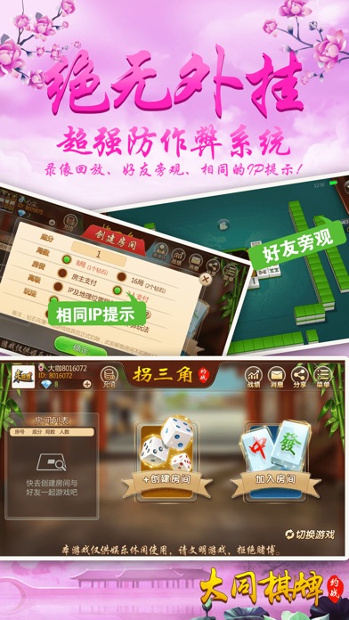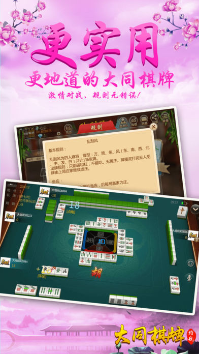 〜〜〜游戏介绍〜〜〜 【最地道】 刺激的大同麻将玩法,内含乱刮风和拐三角,可碰、杠,不能吃牌,风牌点亮杠出,加分迅速,牌局多变。富有别致趣味性。要玩就玩大同人自己的麻将。 【最好玩】 再也不用苦于配桌,全民手机时代,你可以再手机上随时随地和亲朋好友搓麻将,是传统麻将馆的有力补充。快来和亲朋好友一起开房,决一高下吧! 【最稳定】 大厂出品,确保游戏过程更加稳定,专心玩游戏,没有掉线卡顿烦恼。 【最靠谱】 可以录像回放,同IP报警,杜绝外挂,真实可靠。 【最智能】 智能提示、界面大方更具人性化,支持智能单独、分开支付房费。