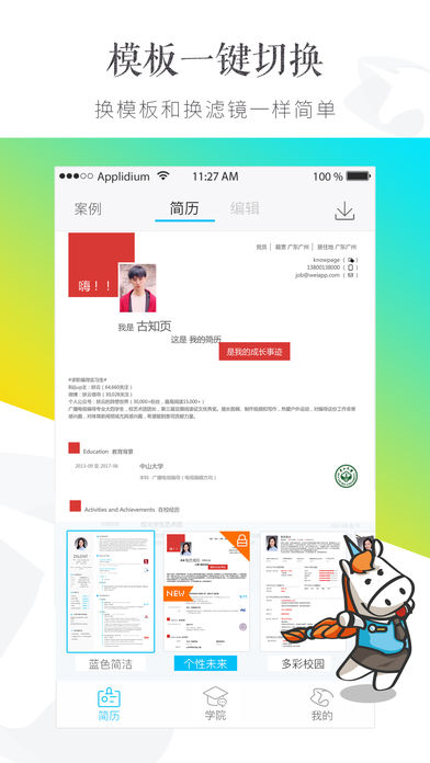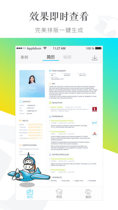 内容提要: 手机做简历,用知页App。 【最美简历模版——随心切换】 数十款简历模板一键切换像美图秀秀切换滤镜一样简单,自动生成的完美简历排版。 由世界500强企业HR和设计师精心制作,反复调校出专业又高颜值的简历模板。 【数据云端同步——随时发送】 知页的电脑版与手机版的数据即时同步,独有的所见即所得简历制作方式。 电脑不在身边,依旧可以使用知页App随时编辑和导出,不放过每一个求职机会。 登陆电脑版知页:www.zhiyeapp.com 【职场新人的必修课——知页学院】 “知页学院”全新上线,点击查看知页精心制作的简历、面试和求职的浓缩音频、文章。还有每周给你推送提升工作及职场认知的新知识。省时省力提升职场竞争力。 知页是一款高颜值简历制作App, 精选海量简历模版, 专为求职找工作、面试、应届毕业生及白领准备。新模块“知页学院”将为应届毕业生及求职人士提供面试和职场向导。 【联系我们】 微信内搜索“知页”公众号,后台留言。 email: hi@weiapp.com