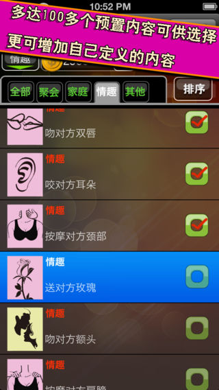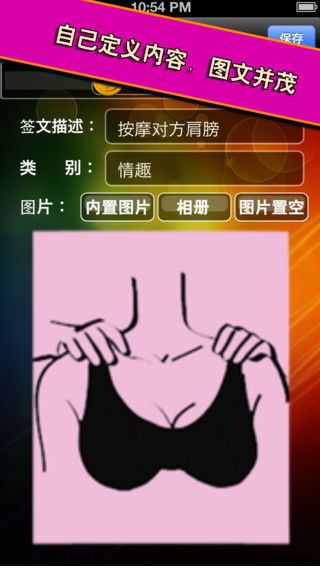 二人世界有什么激情四射的游戏可以调情,试试这个情趣抽签游戏吧。 老夫老妻,有些欲望还是开不了口,让抽签来帮你们做决定吧。你们要做的就是听从游戏的安排。 情趣骰子?情趣轮盘?抽签?覆盖骰子和轮盘的玩法。 专为手机的特点设计的游戏形式,更适合不方便带道具的场合,简单易用易带。 手机摇一摇,就能游戏。轻松简单。 有图有真相。Q版示意图搭配文字描述,气氛更好。 适合夫妻,情人,夜店达人玩的游戏。提升气氛。 聚会,露营,夜店,住所,各种场合适用。 4种类别的内容设定,家庭,聚会,情趣,其他。 内置100多个图文并茂的内容。后续版本免费升级,并有更多场景,更多内容正在制作中。 主要特性 1,100多个图文并茂的内置内容 2,可以自定义内容 3,支持选择系统内置图片 4,多种场景模式支持多种场景