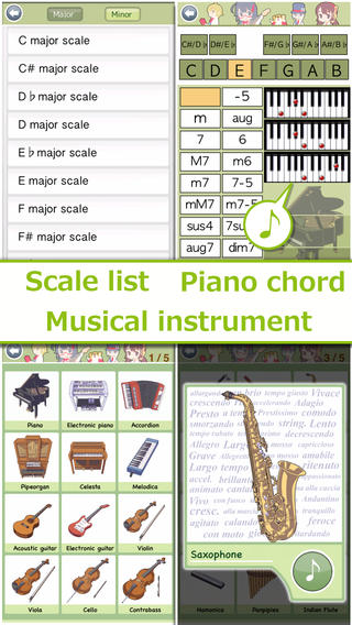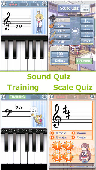 Is an application which use the concept of learning while enjoying music. It has sound quiz and 3 modes of musical scale quiz. This application helps you cultivate a better understanding of music in a pleasant way. When you are asked a question, you can find easily find the answer using the musical scale table, musical instrument dictionary and the piano chord chart provided by this program. The musical instrument dictionary have about 50 handwriting illustrations. You can also listen the sound of a specific musical instrument. If you cannot read musical notes or if you don't have a good musical sensitivity, you can use the training mode to learn and improve you abilities. Cute characters will help you cultivate a better understanding of musical theory in a pleasant way. People who experienced a musical instrument so far can challenge their own musical sense. Persons who did not experienced an instrument so far may also find this application interesting. With each clear goal achieved, the collection will have more items. Do your best to complete all the collection. Non-retaina terminal(ipad,ipad2,ipadmini) is Non-compliant.please note that.