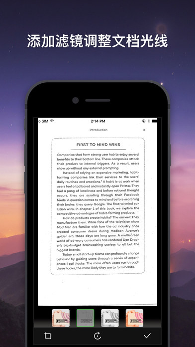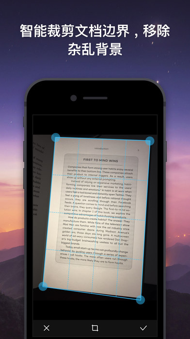 全能扫描仪将你的手机变成移动扫描仪,将纸质文档、照片生成高清PDF 文件,简单实用。 功能特色: *扫描书籍、名片、收据、合同等任意纸质文档或照片 *自动裁剪文档,移除杂乱背景,你也可以手动调扫面文件边框和方向 *将扫描文档PDF保存到手机上,打印或者分享 *可将多个扫描文件组合成多页PDF 非常给力的办公软件,赶快使用你的设备扫描、打印以及管理文档吧!