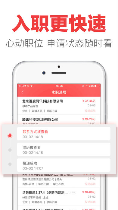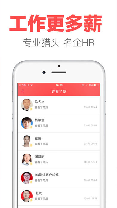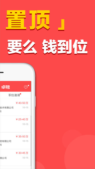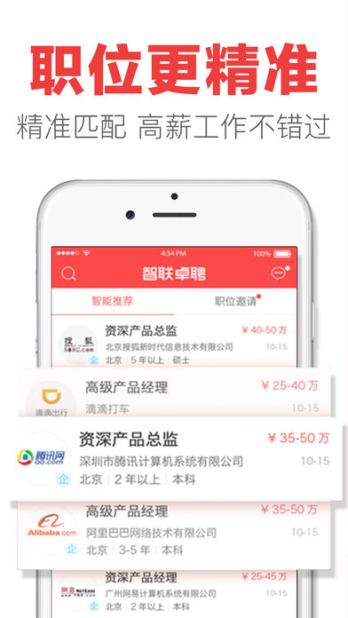 要么大公司,要么钱到位! 智联卓聘,注册你的专属猎头服务,五星猎头为你找满意的工作! 你可能在Boss直聘,拉勾网,中华英才网,猎聘网,前程无忧51job等求职网站投过简历,是否都石沉大海? 那么快来智联卓聘,注册你的专属猎头服务,五星猎头全队待命,只等你来! [职位邀请]世界500强专业hr和猎头在线为您提供职位,你的工作你来选 [即时沟通]主动出击,更有胜券,争取心仪的工作,从卓聘聊聊开始 [求职进展]简历状态、应聘进度实时推送,让你第一时间掌握工作机会 [双方互评]HR、猎头信用评价,专业度、态度无保留呈现,多维度考察职位价值 [隐私保护]开启企业屏蔽,跳槽更安全,找新工作不必和老东家结仇 [发现职位]职位太多懒得搜索?我们给你推荐,大数据智能筛选,动动手指一键申请 20万+猎头在线,40+种行业高薪职位,日均30万人收到职位邀请! 500强企业HR在线沟通,透明清晰的职位信息搜索,是您找工作跳槽的不二之选! 不同于赶集、58同城招聘的全新招聘定位! 智联卓聘——主打中高端职位,让你更有目的性地找工作,让中华英才们的前程无忧光明!