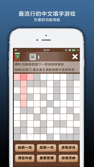 2014年最新制作的填字题库,现在就来下载吧! 一键求助微信朋友圈,时下最疯狂的社交游戏! 最疯狂的中文填字游戏登陆手机,你还等什么! 疯狂填字是最早的在线中文填字游戏,现在你可以在手机上玩填字了,既打发了时间,又增长了知识,你准备好挑战史上最疯狂的中文填字游戏了吗? 1、游戏一开始只有几道题可以选择 2、游戏时请选中空格查看提示 3、点击字母按键输入首字母拼音 4、正确完成词条就会转换为汉字显示 5、点击+号弹出功能菜单 6、完成题目80%解锁下一题 7、完成100%可以解锁答案,而且再奖励解锁一题 8、完成或购买道具解锁后可以双击查看答案 帮助中心还可以 1、切换…