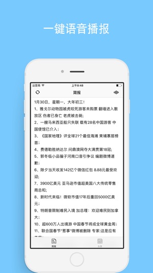今日简报是一款简洁的新闻APP,用最少的时间了解世界。 1.每天一份简报,一键语音朗读。 2.国内头条实时更新。