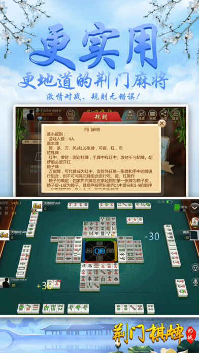 〜〜〜游戏介绍〜〜〜 【最地道】 地道荆门地区玩法,可碰、杠、吃牌,筒条万风共计136张牌进行4人游戏,有包胡,有金顶,富有别致趣味性。要玩就玩荆门人自己的麻将。 【最好玩】 再也不用苦于配桌,全民手机时代,你可以再手机上随时随地和亲朋好友搓麻将,是传统麻将馆的有力补充。快来和亲朋好友一起开房,决一高下吧! 【最稳定】 大厂出品,确保游戏过程更加稳定,专心玩游戏,没有掉线卡顿烦恼。 【最靠谱】 可以录像回放,同IP报警,杜绝外挂,真实可靠。 【最智能】 智能提示、界面大方更具人性化,支持智能单独、分开支付房费。