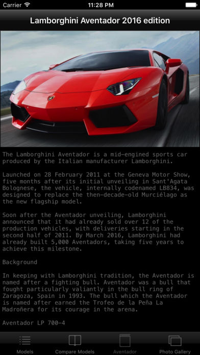 Specs for Lamborghini Aventador 2016 edition is an amazing and useful application for you if you are an owner of Lamborghini Aventador 2016 edition or a big fan of this model. In Specs for Lamborghini Aventador 2016 edition application you can see the history of this model, all the engines available on this model, all the performance and dimensions specifications and the standard equipments. If you want to view two models (two different engines, two different models in parallel) Specs for Lamborghini Aventador 2016 edition have the Compare section in which you can compare side by side two Lamborghini Aventador 2016 edition models. Also, you have a section with photo gallery where you can view and save your preferred photos of the Lamborghini Aventador 2016 edition. Enjoy!