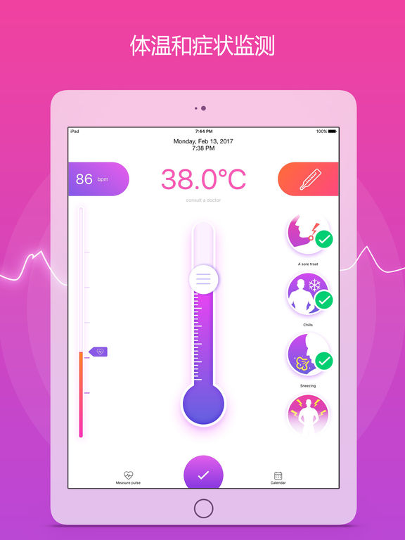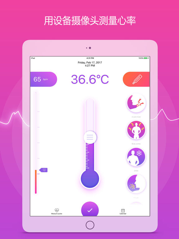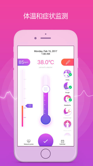 开始一个健康的生活方式。测量你的脉搏和体温,选择症状,做笔记---注意你的健康状况,每天保持强壮和长寿。点击写下你此刻的心情。你甚至可以为未来添加注释。 温度计 -测量体温可以帮助你发现疾病; -平均正常体温一般为98.6°F(37°C); -将你的设置从摄氏度改为华氏度,反之亦然。 心率测量 -确保你在测量前至少躺10分钟; -正常静息心率范围从每分钟60到100次。 HEALTHKIT同步 --应用程序支持同步健康信息与苹果健康应用程序。 致力于您的健康,改善您的生活质量。