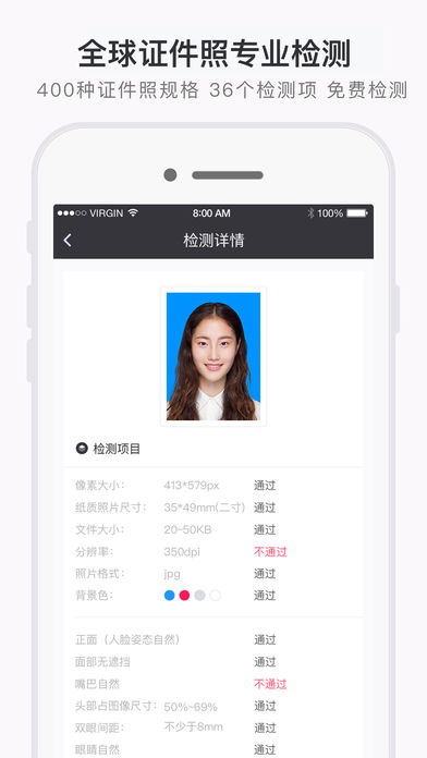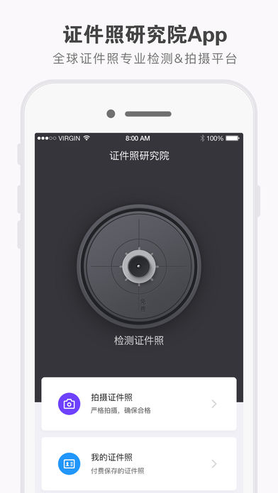 20秒,一键制作合格证件照 证件照研究院App是一个特黑科技、特别设计、特别方便的证件照专业检测&证件照制作平台。 1、专业的证件照合规性检测平台 支持从各国签证到各类报名考试在内的近400种证件照规格,36个检测项,全面进行证件照合规性检测: ● 从「像素大小」到「分辨率」 ● 从「jpg」到「背景颜色」 ● 从「人脸姿态」到「眼睛视线是否正常」 ● 从「阴阳脸」到「不带墨镜或粗边黑框眼镜」 ● 从「头部长度」到「双眼间距」 ● 从「中性表情」到「肩膀是否等高」 ● 从「色彩正常」到「是否模糊」等36项证件照合规性检测 确保证件照符合你的要求。 2、专业证件照制作平台,制作证件照,一键生成。 当你的证件照检测不合格,或需要证件照制作时,证件照研究院提供证件照制作服务。 严格的拍摄环境检测,对人脸姿态、眼睛视线、双眼水平、服装突出、肩膀水平、光照充足、光线均匀进行检测,确保用户拍摄出合格的证件照。 拍摄环境检测通过,一键生成证件照。 3、写给你 当你看到此,我相信咱们已经是一个些许期待的开始,「证件照研究院」产品组是一支立志将证件照技术和产品做到实用&极致的移动互联网团队,从证件照的合规性检测、到证件照的拍摄制作,我们真心的期待在你所需证件照的任何场景都能给你提供一些方便。 「证件照研究院App」只是我们一个简单的开始,我们相信他定放光芒,若你在使用过程中有任何疑问或困惑,或对产品有任何想法,或想找我们合作(比如接入证件照合作性检测),欢迎随时跟我们联系: ● 客服微信号:idphoto2017 ● 产品部电话专线/微信号:15961872971 ● 邮箱:id-photo-verify@venpoo.com