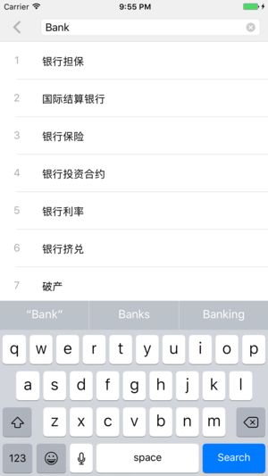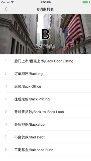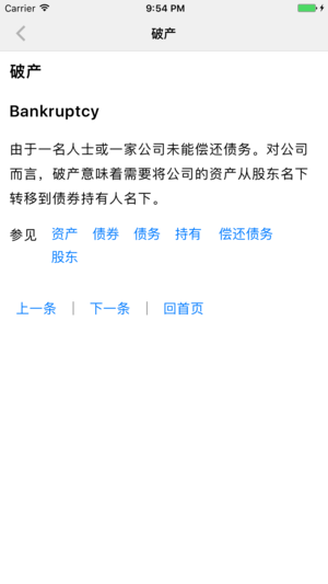 高盛金融英语词典,专业的金融词典。这是一本包含商业银行、外汇、投行、证券、资产管理、保险、期货等金融知识的词典,是金融业界人士比较全面的好助手,也是新入行或有志者的“哑巴老师”。 使用iOS原生功能开发,非嵌入网页,操作流畅,界面清新,交互友好。无广告。 功能列表: 1.包含全部1800多条个金融词条 2.词条分类显示 3.支持词条同义词,类别等相互导航 4.支持词条搜索