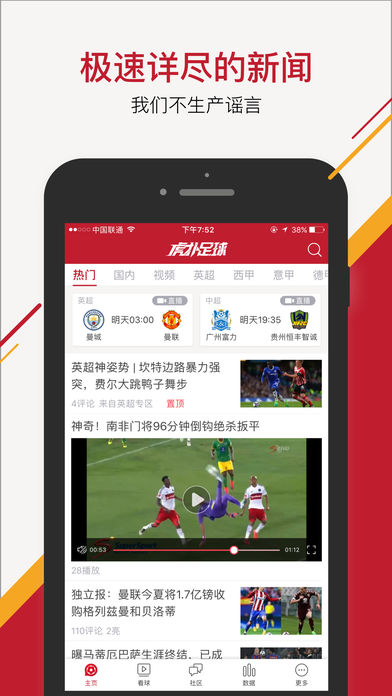 虎扑足球有足球迷想要的一切:直播,社区,新闻,视频和数据等等,涵盖中超、欧冠、英超、西甲、德甲、意甲、法甲、世预赛、欧联等各类赛事,在这里,你可以和数百万人一起看球,一起聊体育。 我们的特色有: - 完整的看比赛体验:提供丰富的直播源,最详尽的比赛数据,包括每场比赛每个球员的进球助攻、射门、抢断、扑救等数据,以及几十万人同时在线聊天的热闹氛围; - 积累10年,认真而有趣的足球社区:你听到过的许多足球梗,就来自虎扑足球社区,而你看到过的很多足球分析大神,也是虎扑足球社区的忠实JRs; - 快速详尽的新闻资讯:我们努力以最快速度报道国内外足球大小新闻事,只有一种情况能让我们不追求第一时间报道:我们不确定这条新闻的来源是否可靠——是的,我们不生产毫无根据的谣言。 球迷们这样评价我们: “虎扑足球终于有App了,一听说就来下载了,我都等了好几年了啊!” ——@欧冠决赛见 “虎扑论坛还是大神多,氛围好啊,每天刷论坛停不下来。” ——@中国队加油 “新闻我只看虎扑的,虎扑不报的新闻,我从来都不信。” ——@来看英超直播吧