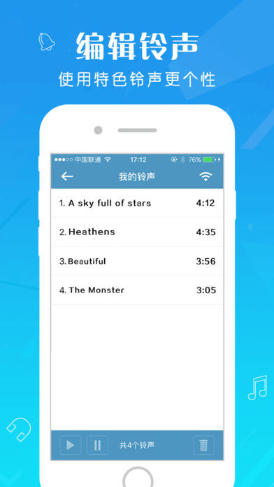 iPhone手机换铃声专用软件,千万用户的最佳选择。 ·万首精选铃声,全网最全。独创语音搜铃、文字变铃声功能,实用有个性! 【专注提供高音质好铃声】 【铃声大全】最新最火歌曲铃声,每日更新1000+,同步最热影视铃声、综艺节目铃声,好听铃声多多! 【铃声品质】每首铃声都不低于128kbps,让来电、闹铃、短信铃声更亮更炫,简直是真正的听觉享受! 【铃声制作】支持铃声剪辑、文字变声音,录音可变声,让铃声制作轻松更好玩,最好用的手机铃声管家。 【分类最全】提供多样热门分类任你筛选,中文流行、欧美日韩、DJ舞曲、幽默搞笑、网络神曲、影视金曲、游戏动漫、经典老歌一个都不少!