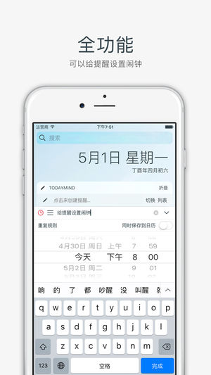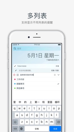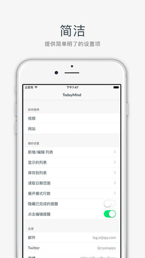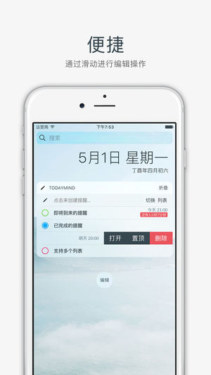 # 什么是 TodayMind - 直接在通知中心 查看/创建/编辑 提醒事项,前所未有的快! # 主要功能 - 在通知中心显示使用提醒事项 - 新建/编辑提醒事项列表 - 随意设置列表颜色,比自带颜色更丰富 - 可以设置读取的日期范围 - 几乎支持提醒事项的全部特性 # 如何设置 - 打开 TodayMind 并授权访问「提醒事项」 - 打开「通知中心」并滑动到「Widgets」页面 - 点击「编辑」添加「TodayMind」小部件 - 完成了! # 使用小提示 - 点击输入框来创建新的提醒 - 点击提醒可以直接进行编辑 - 长按提醒来复制标题内容 - 创建过程中可以设置闹钟和…