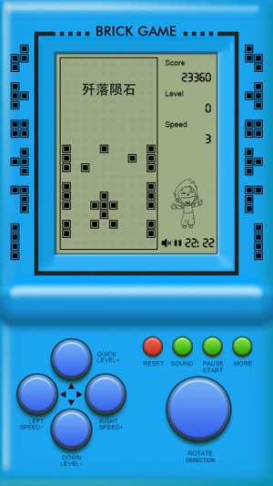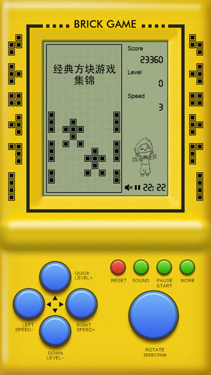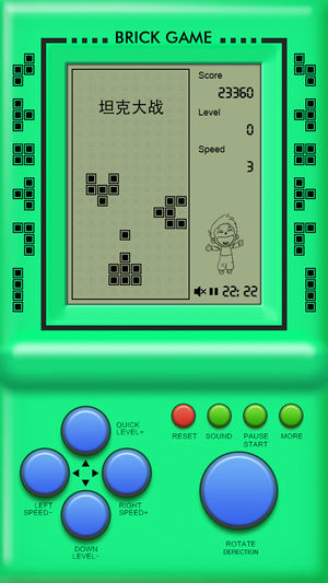 重拾童年的记忆,向方块发出新的挑战吧! 只因童年时我在别人的手里看了你一眼,你却亮瞎了我的钛合金狗眼。梦想着能有一天再拥有你 — 经典方块掌上游戏机,你一直在我身边从未走远。 经典方块游戏,没有玩过就没有童年! 不因寂寞,只为童心,等你来! • 打飞机(歼落陨石) • 打飞机(超级战机) • 打飞机(飞越峡谷) • 泡泡龙 • 贪吃蛇 • 坦克大战 • ... [ 温馨提示 - 如何切换游戏 ] 请先点“RESET”,回到启动画面,然后点击右下角那个很大的“ROTATE”按钮,就可以选择游戏了。选好后,点击“START”即可开始游戏。