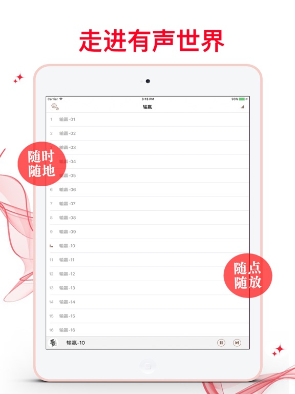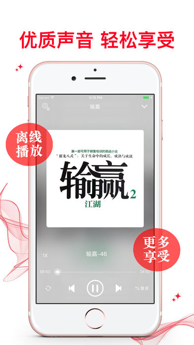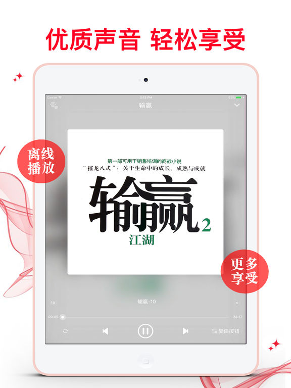 人生本是过程,结局不重要,过程才最精彩! 本应用仅献给奋斗在商场中的你! 软件功能: 1.通用应用,同时支持各种设备 2.可以自动顺序播放功能 3.可以自动记录播放位置,不用担心下次找不到听到哪 4.支持离线播放,即使不联网也一洋听,到哪都不怕 5.支持手动拖拽前进、后退播放 6.精确到分钟的睡眠定时功能,让您睡眠更轻松 7.支持多任务功能,让您一边享受精彩有声读物一边还能打开其他的软件……做一切你想同时做的事 8.在兼顾软件容量以及更多课程的情况下,我们最大限度保证音频的高质量,每个有声读物片段都是经过我们精选和亲测