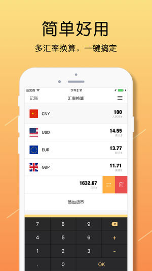 2018年最佳汇率换算工具,出国旅行购物必备。 * 快速汇率换算,多种货币一键换算,操作简单; * 全球汇率覆盖,支持160多国家币种间的汇率换算; * 汇率实时更新,提供最新的在线汇率,计算结果更精准