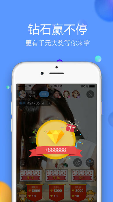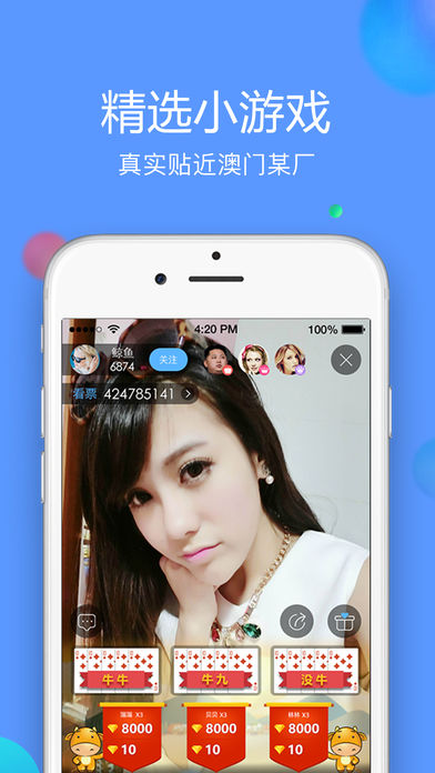 怼游戏,玩主播,不是每一种直播都可以这么嗨。 直播中的极致体验,零距离的主播游戏互动。 全国高校校花,带你猜各种游戏。 毕竟狭路相逢勇者胜。 只要你敢跟我们随时怼,我们就敢让你天天赚。 【经典竞猜】校花带你玩直播,还原经典澳门某场小游戏,时时刻刻猜不停。 【王者电竞】电竞战队对战来袭,大神出装,极限微操,王者荣耀、DOTA、LOL,主播带你竞猜每天最热比赛。 【荣耀主播】高校校花、王者大神,活好不粘人。随时随地,倾慕激情。 【极致体验】玩得开心,猜的爽,赢的嗨。 记住,猥琐发育别浪。 来鲸鱼直播,主播与你同在。