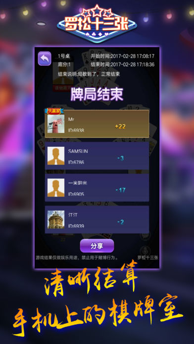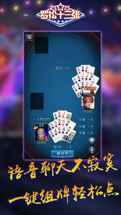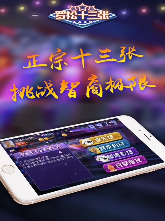 【罗拼十三张】是一款考验玩家智慧、勇气和策略的益智类博弈扑克牌游戏,主要流行于江苏、上海、浙江、福建、江西、山东一带,也称为十三水、十三道、十三支、罗松和拼罗松等。具有开房间、召唤好友、邀请好友对战等社交娱乐功能。一副牌(除去大小王),2~4人游戏,每人13张牌。玩家把13张牌分别以头、中、末道同时摆出来比较大小,确定胜负,注意出牌时,第一墩 < 第二墩 < 第三墩,未按照此规则出牌者视为相公。其中的牌型有:同花顺、炸弹(四条)、葫芦、同花、顺子、三条、两对、对子和乌龙(散牌)等,是一款正宗、流行、传统玩法的手机益智游戏。