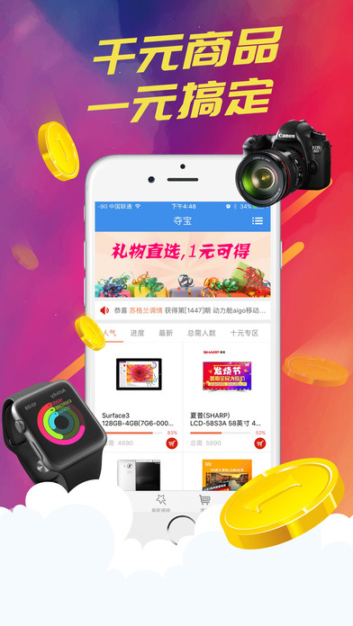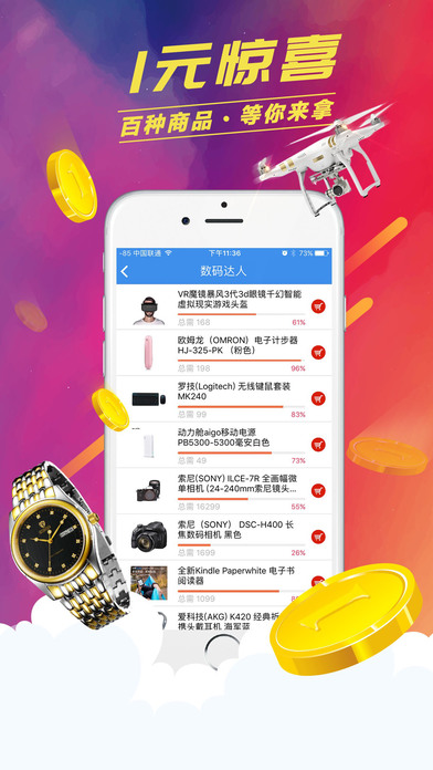 【一元云购】是专注于移动端的众筹分期购物平台。只需要花1元就有机会得到价值千元的真实奖品。 开奖快!品类多!中奖易!趣味足!与万千用户开开心心玩众筹,轻轻松松拿大奖! ————一元云购,千元商品一元搞定———— -百种新潮商品任你选 -千元商品轻松一元搞定 -100%正品保证,全国包邮 —————一元云购,公平公正公开————— -公平:所有参与用户,都享受同样的权利与义务。 -公正:引入第三方数据源,保证众筹分配结果的随机性,保证绝对公正性。 -公开:计算公式和相关数据完全公开。 ————一元云购,万人亲测值得信赖———— -80000+幸运宝宝已经分享了中奖纪录,下一个幸运儿在不停产生 特别声明:本应用所有活动与内容跟苹果公司无关