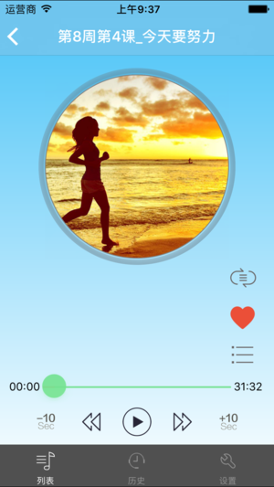 限时促销!!!马上下架了! 此app中收录了《简爱跑步12周》有声教程。 简爱跑步12周,从零基础到轻松愉悦的跑10公里,你只需要带上耳机徜徉在48段音乐的海洋,跟随节奏和语音指引——从走到跑,像恋爱一样去跑步。 把枯燥的学习跑步转变为戴上耳机听音乐,跑出动人的节奏。 音乐能分散听者在疼痛和疲惫上的注意力,从而提升运动状态,增强运动持久性,加速新陈代谢。听音乐运动的人,往往能比不听音乐的人跑得更远,速度更快。世界上最顶尖的运动音乐研究者之一、伦敦布鲁内尔大学的卡拉奇奥菲斯博士曾形容音乐是一种“合法的体育兴奋剂”,最关键的问题在于找到适合的BPM(节奏)音乐,简爱跑步十二…