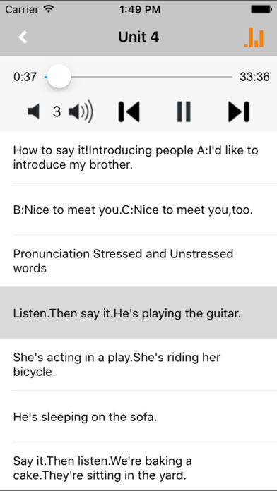 【爱听说】APP系列,是辅助学习神器,让语言学习变简单! 因为懂你,所以有效,不只是学英语,更是说英语! *** 爱听说,您的专属私人外教! *** 爱听说,像学母语一样学英语! *** 爱听说,让世界听你说,立即说! ■■■ 本软件配套朗文版的《国际英语教程(SIDE by SIDE)第1、2册》最新教材。 课本全覆盖,让您全面掌握字母、发音、单词、短语、句子、语法及课文内容。 量身定制教材,课程设置出发点明确,从易到难逐步巩固,个性化互动体验,学习事半功倍,听说读写综合素质全面提升! 打造移动学习新体验,用科技放飞梦想,让学生轻松拥有浸入式学习环境!家长省心,孩子开心,让学习充满乐趣! 【特色功能】 - 学习神器,提分超速。 - 内容丰富,逐一掌握。 - 有效预习,复习巩固。 - 操作简单,功能强大。 - 语音清晰,播放灵活。 - 即点即学,随时随地。 - 纯正发音,口语流利,即学即用。 - 朗诵配乐,怡情养性,陶冶情操。 - 后台播放,锁屏状态可继续听读。 - 原版教材,完美同步最新版课本。 ■■■ —【爱听说】APP系列 — 致力于中小学在线学习,通过“移动互联网+教育”平台,精心打造教育类APP,让学生快乐学习,健康成长。 我们的使命是“打破语言、文化和地域上的障碍”,失志为用户提供绝佳的语言学习体验。 提供更多专属应用产品和服务,旨在持续激发学生的语言学习兴趣。 爱听说系列专注学习辅导,只为让您学得更出色。 爱听说数十万中小学生的选择。 ■学你想学,邂逅知己 有伴有爱有力量,再也不怕学习没动力! ■学半功倍,人手必备 碎片时间也可以高效利用,口袋学习必备助手! ■随时随地,即学即用 随手,拾起一段时光,让学习融入你的生活;不经意间,积少成多,却是轻松愉悦;回首时,已越过一座座小山,享受收获的喜悦...... 与原版教材《朗文国际英语教程(SIDE by SIDE)第1、2册》完美同步 最新版(第1册)目录: 1 简介 个人信息 与人会面 2 地点 主格代词 教室物品 家中房间 城市和国籍 市内场所 3 现在进行时 日常活动 公报 4 简短回答 所有格形容词 日常活动 5 一般疑问句 简短回答 形容词 所有格名词 描述人和物天气 6 复习 现在时行时: 复习 地点介词 家庭成员 描述活动和事件 7 介词 单数/复数:简介 8 单数/复数 形容词 9 一般现在时: 一般疑问句 否定 简短回答 10 一般现在时: 一般疑问句 否定 简短回答 公报 11 宾格代词 一般现在时: 12 对比:一般现在时和现在进行时 形容词 公报 13 Can Have to 14 将来进: 时间表达法 15 过去时 规则动词 介绍不规则动词 16 过去时: 一般疑问句 简短回答特殊疑问句 更多不规则运词 17 过去时 公报 最新版(第2册)目录: 一 时态复习 一般现在时 现在进行时 一般过去时 将来时 时间表达法 间接宾格代词 描述现在、过去和将来的动作 生日和礼物 讲述友谊 二 可数/不可数名词 食物 买食物 做客吃饭 描述饮食喜好 三 单位词 可数/不可数名词 祈使句 买食物 描述食物 在餐馆就餐 食谱 四 将来时:时间表达法 讲述将来 可能性;概率 可能性 警告 五 比较级 物主代词 进行比较 建议 表达观点 赞同和不赞同 六 最高级 描述人、地点和事物 在百货商店购物 表达观点 七 祈使句 方向 市内场所 公共交通 八 副词 副词的比较级施事名词 描述人的行为 描述计划和打算 行为后果 九 过去进行时 反身代词 描述过去正在进行的动作 十 Could Be Albe to Have Got to To+形容词 表达过去和将来的能力 给出理由 十一 过去时复习可数/不可数名词复习 体检 医生建议 健康 营养 十二 将来进行时 时间表达法 描述将来的活动 表达时间及时间的持续 打电话订计划 十三 代词复习 动词时态复习 提供帮助 表明所有权 家庭问题 朋友 附录 听力文字 词汇表 基数词 序数词 不规则动词:过去时 索引 谈论喜欢和不喜欢 称赞美食 推荐食物 请求重复 赞同和不赞同 表达观点 请求重复 表示赞同 对坏消息的反应 表达义务 寻求建议 打电话 提出建议 发音练习 对立重音 弱读for 辅音和元音之前的of 带有or的选择疑问句 辅音机同的单词连续 对音重音 did 和would you have to和 have got to must 和mustn't will相前的缩写 被删除的h音