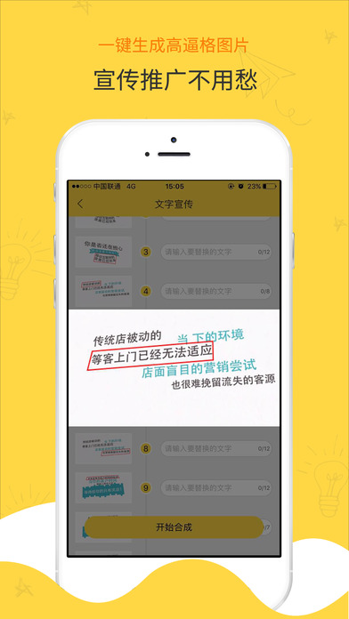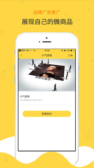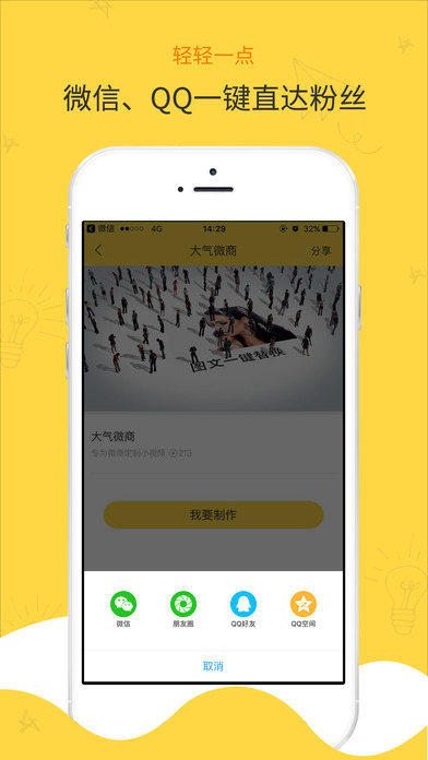 1分钟制作小视频,朋友圈恶搞,产品营销宣传,还有神秘“明星“来配音,2017朋友圈装A更有料! 我们提供1000套以上视频模板,还能模仿明星声音为您的视频配音。 既有如明星举牌、土豪房产证、洪荒之力等热点,还有如爱情沙画、楼宇表白、纪念相册、婚礼请柬、微商宣传小视频、企业宣传片等场景视频。 我们会挖掘更多好玩的图片和视频模板,定时上新,让你紧跟恶搞潮流。 主要特色 【模仿明星】用户一键制作视频,还能免费选择模仿明星特色声音做配音 【恶搞神器】丰富多样的恶搞图片模板,与热点紧密结合,装A也潮流 【大片制作】超多的主流视频模板,自由选择,总有属于你的格调大片 【快捷制作】只要简单替换文字和图片,即可一键合成你的格调图片和视频 【消息通知】视频作品合成完成后,会有消息推动通知您,使用过程更贴心 【一键分享】一键分享到朋友圈、QQ等社交应用,传播分享与手机保存更轻松 丰富场景 【个人用户】朋友圈晒图炫耀恶搞,在爱情、生日、婚礼等场景下的祝福和纪念视频等 【企业用户】房产、金融、汽车、餐饮等行业产品宣传、企业宣传等,以及业务员对外销售时的视频名片 【微商用户】朋友圈搞笑小视频,提升微商产品在朋友圈宣传的关注度和客户流量